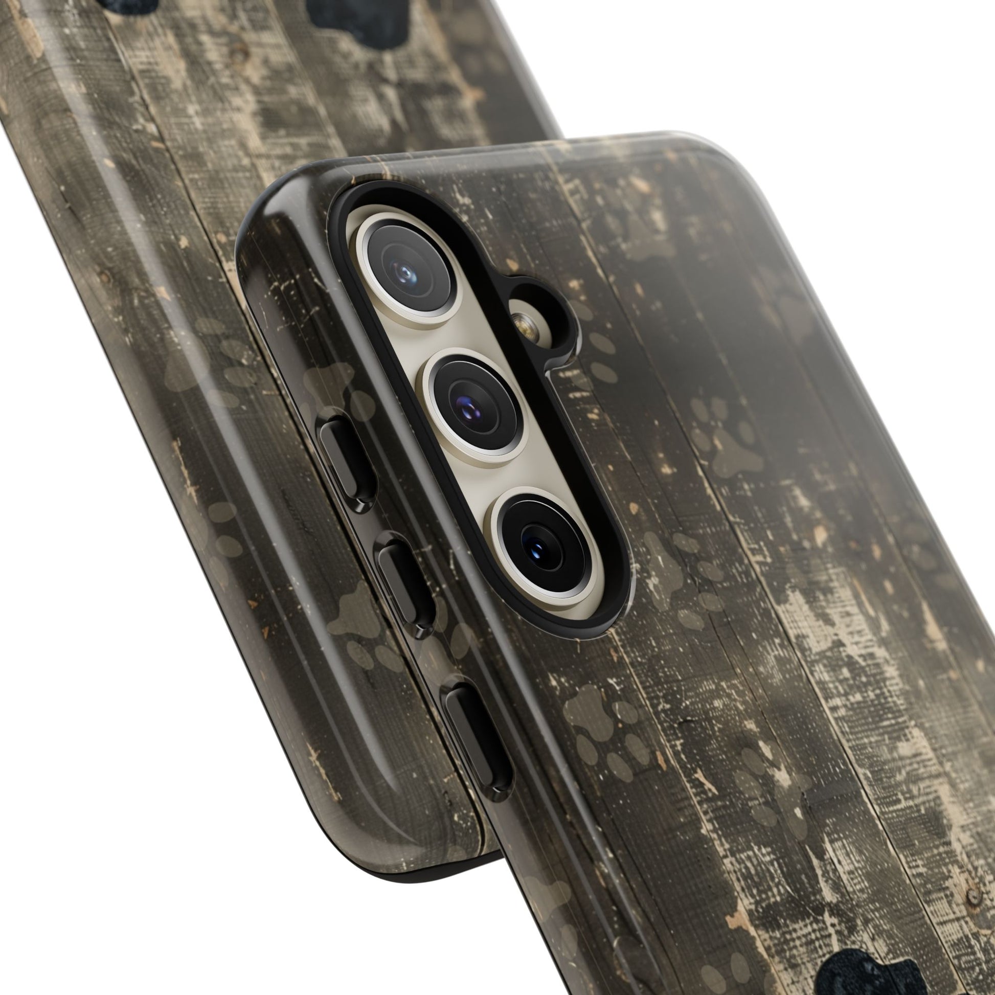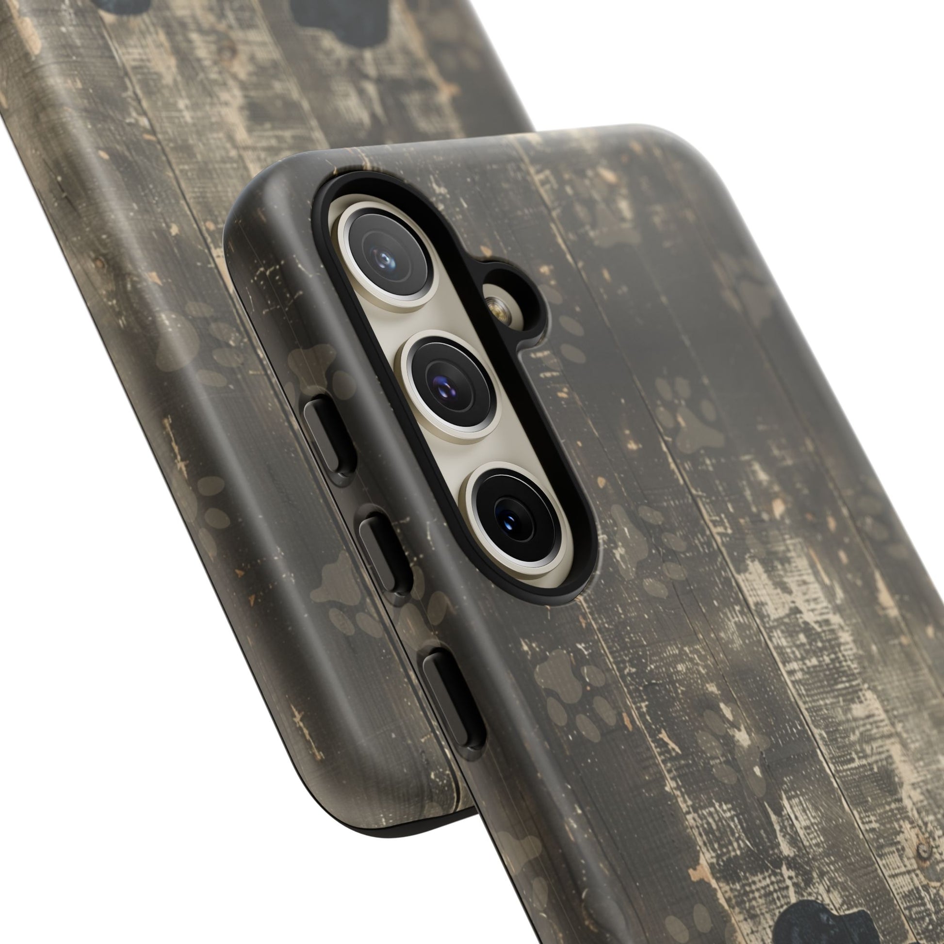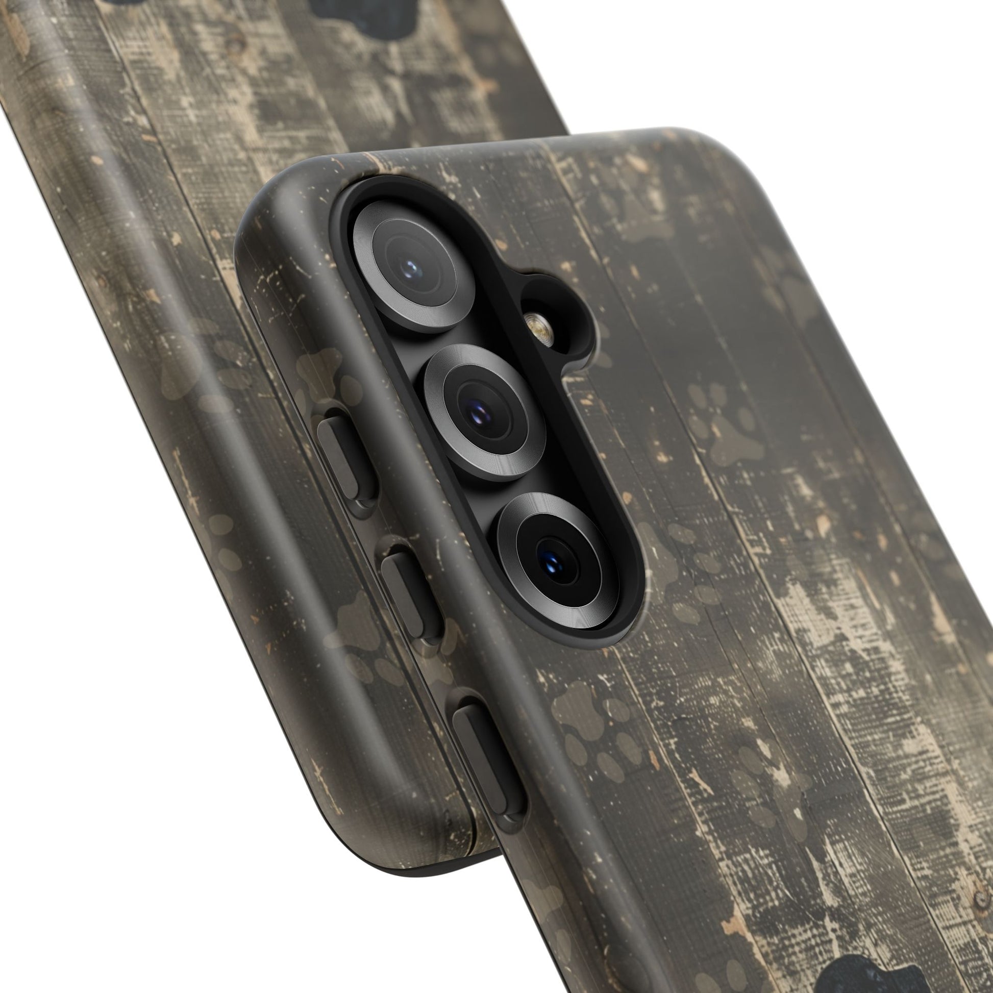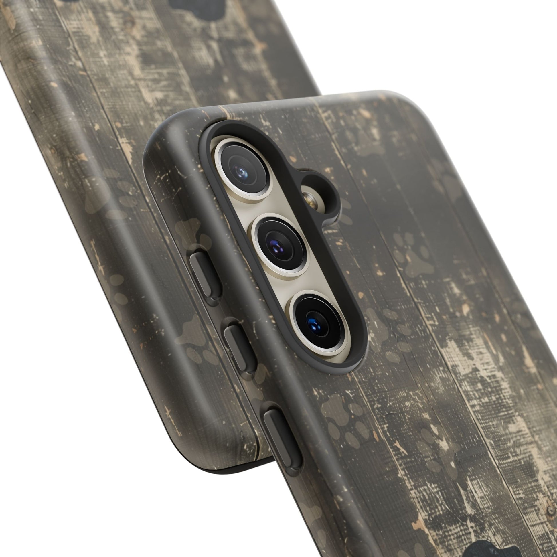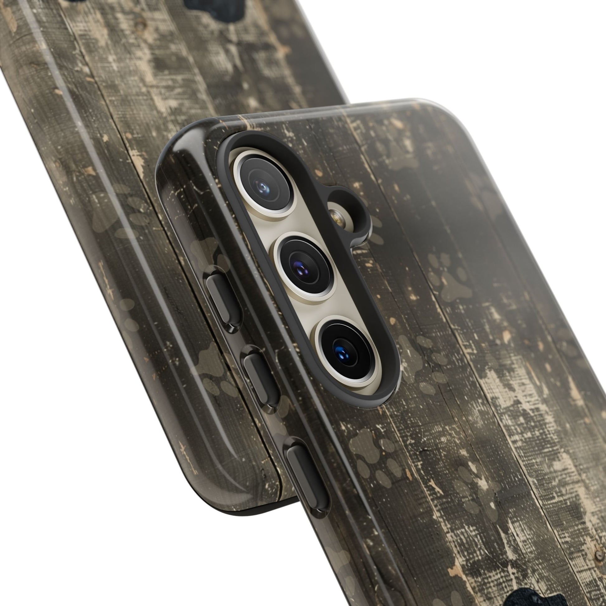 Bark up the right tree with the BarkWood Phone Case! This pawsome case features a graphic of dark distressed wood planks, giving it a rustic, outdoorsy feel. But that’s not all—there are three dog silhouettes sitting in side view, adding a touch of canine charm. To top it off, adorable light brown puppy prints are scattered haphazardly across the front, making it a delightful treat for dog lovers. This case isn’t just a pretty face; it’s built to protect your phone from all those ruff tumbles. Fetch yourself the BarkWood Phone Case and let your phone enjoy a howlin’ good time!