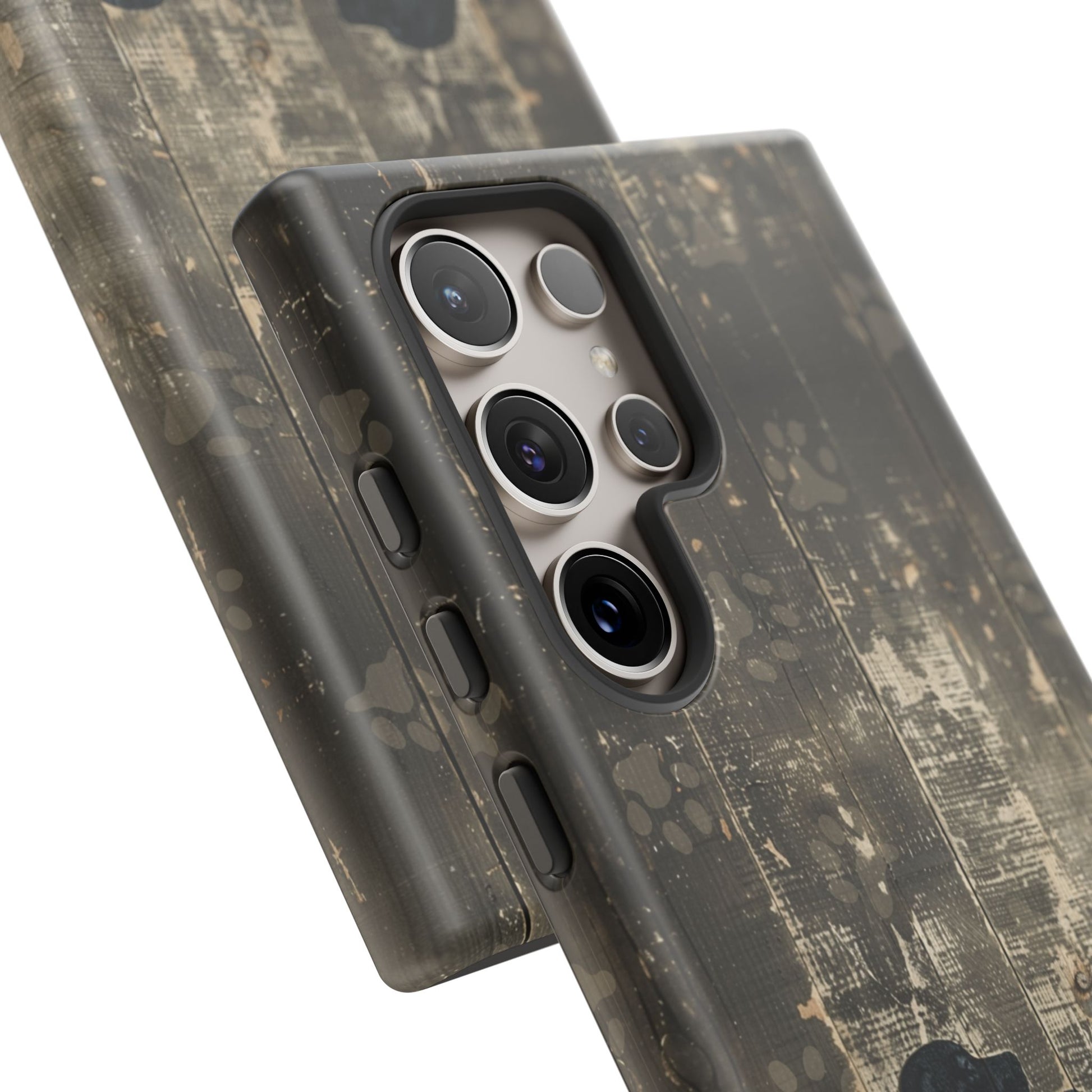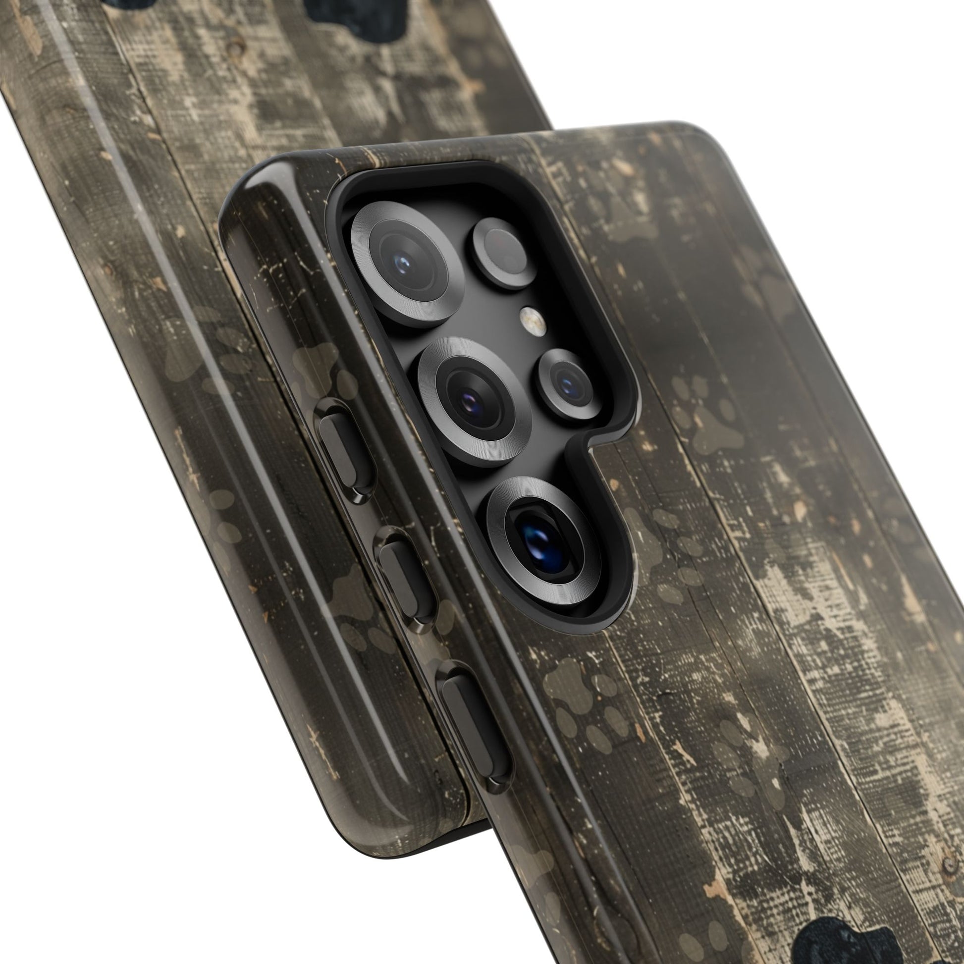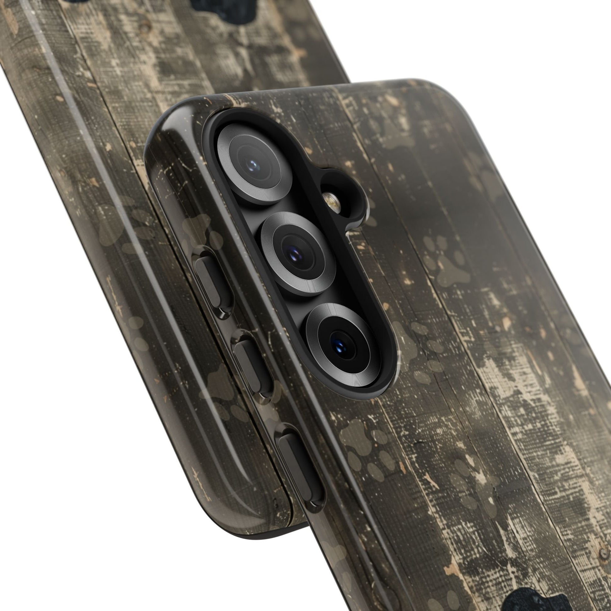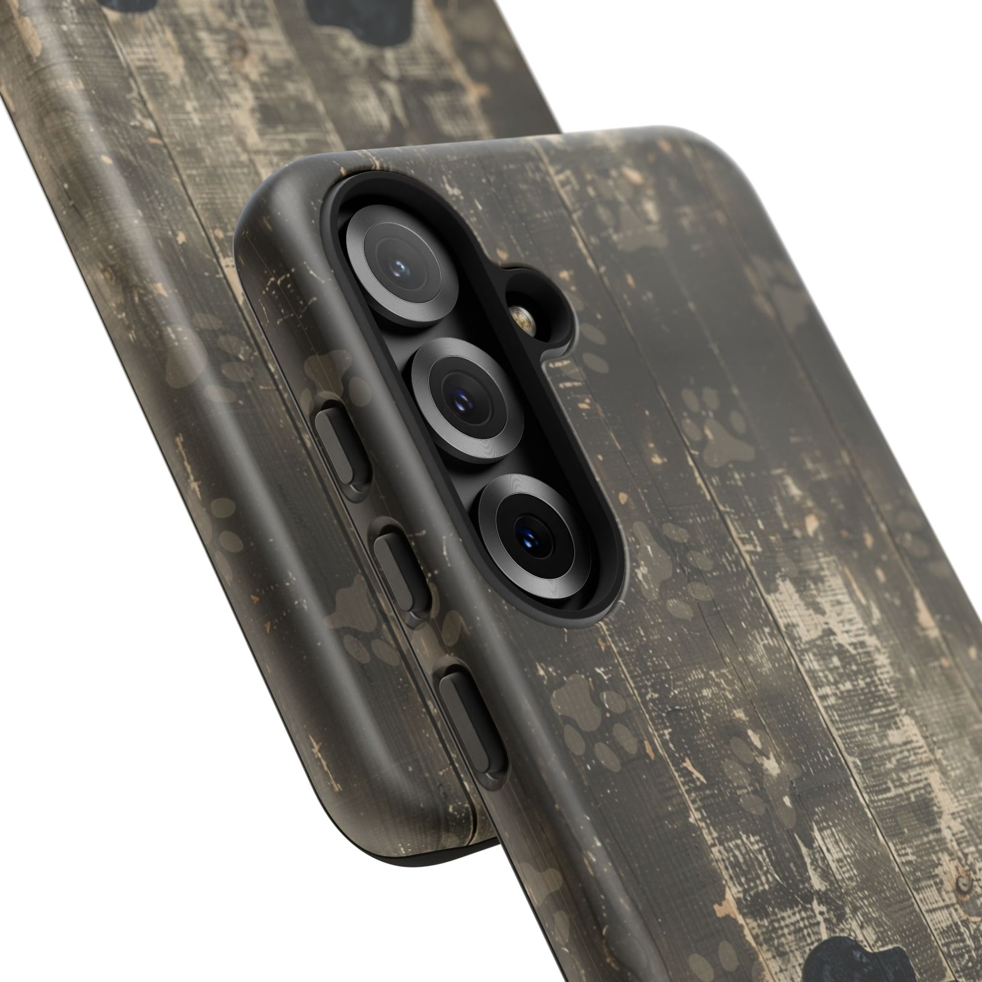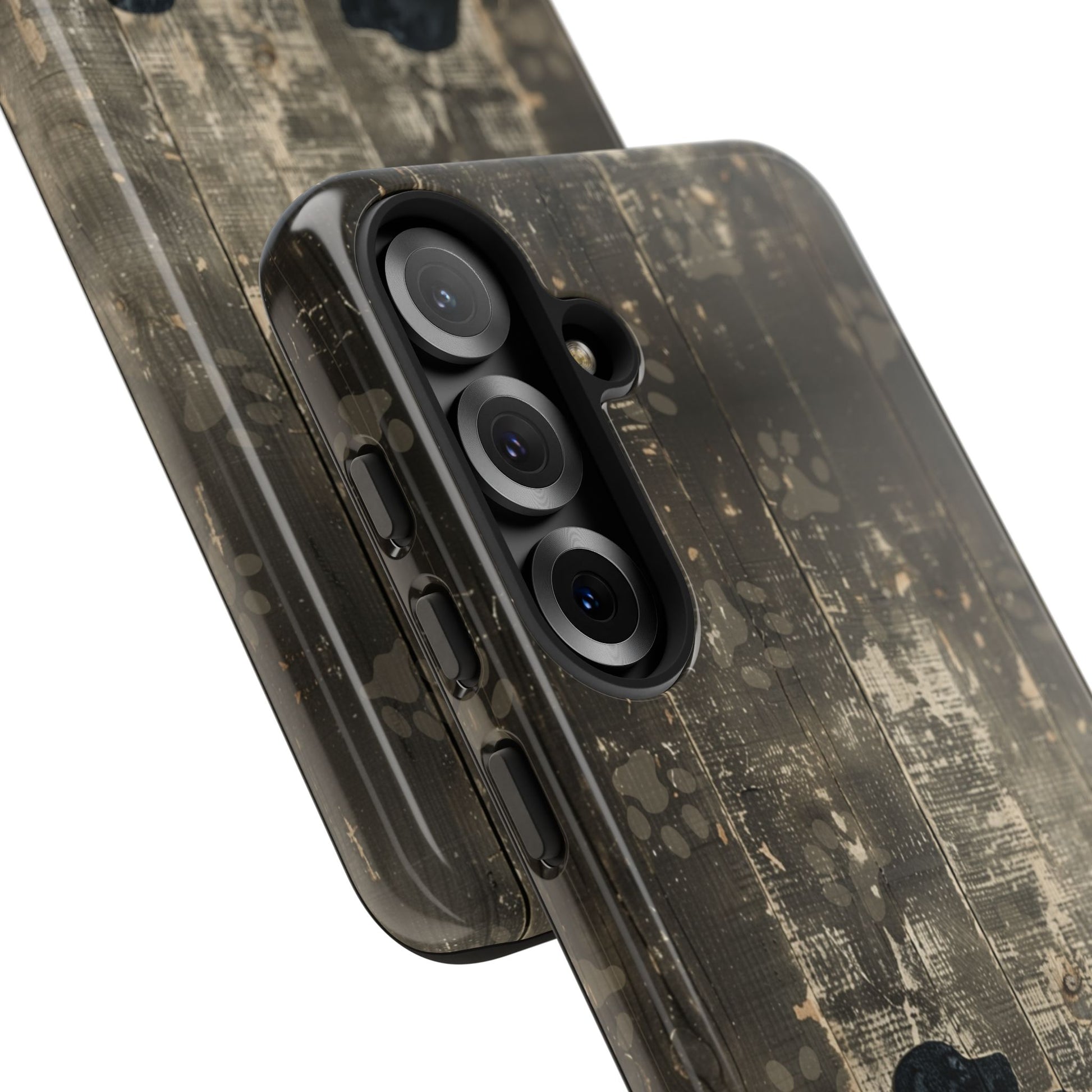 Bark up the right tree with the BarkWood Phone Case! This pawsome case features a graphic of dark distressed wood planks, giving it a rustic, outdoorsy feel. But that’s not all—there are three dog silhouettes sitting in side view, adding a touch of canine charm. To top it off, adorable light brown puppy prints are scattered haphazardly across the front, making it a delightful treat for dog lovers. This case isn’t just a pretty face; it’s built to protect your phone from all those ruff tumbles. Fetch yourself the BarkWood Phone Case and let your phone enjoy a howlin’ good time!
