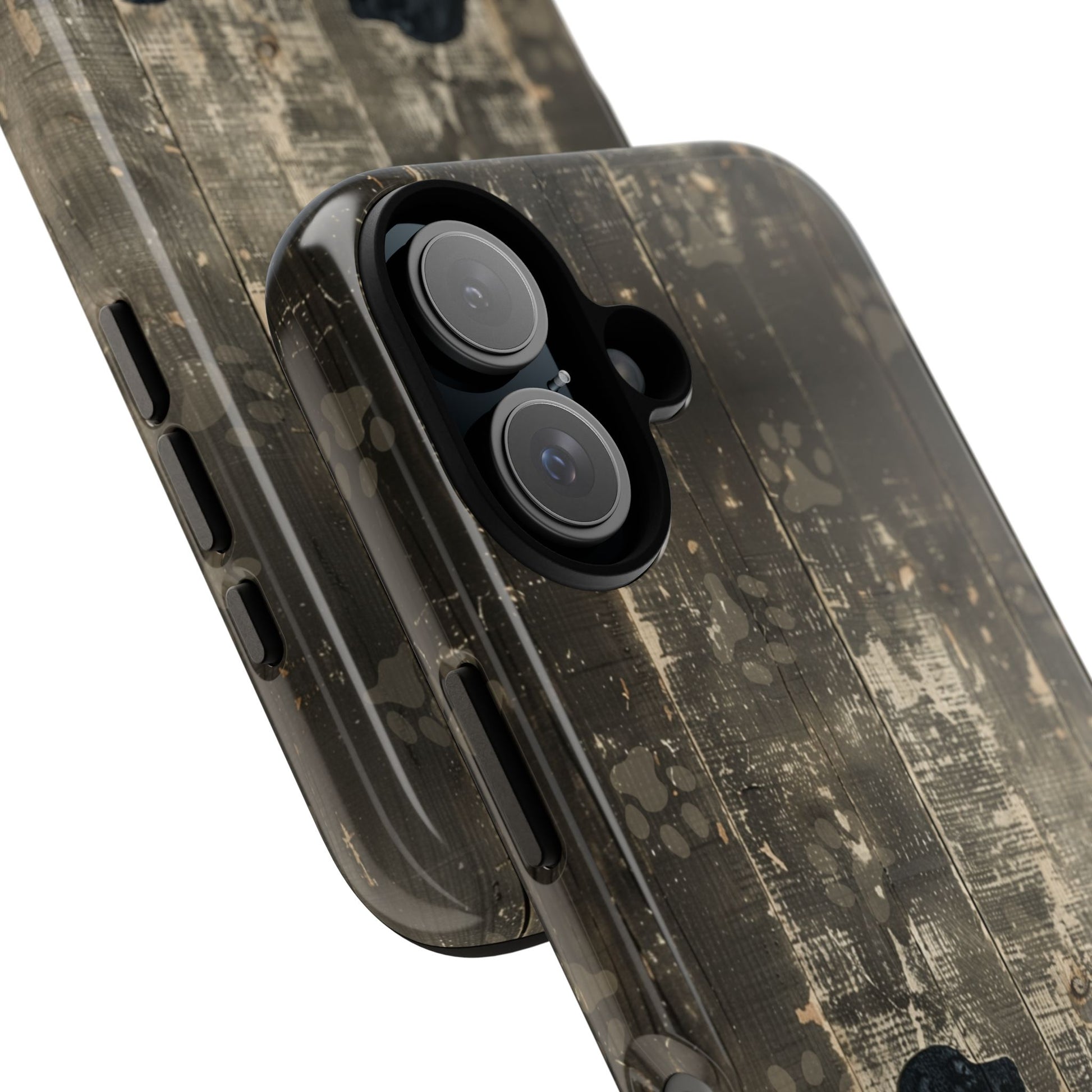 Bark up the right tree with the BarkWood Phone Case! This pawsome case features a graphic of dark distressed wood planks, giving it a rustic, outdoorsy feel. But that’s not all—there are three dog silhouettes sitting in side view, adding a touch of canine charm. To top it off, adorable light brown puppy prints are scattered haphazardly across the front, making it a delightful treat for dog lovers. This case isn’t just a pretty face; it’s built to protect your phone from all those ruff tumbles. Fetch yourself the BarkWood Phone Case and let your phone enjoy a howlin’ good time!