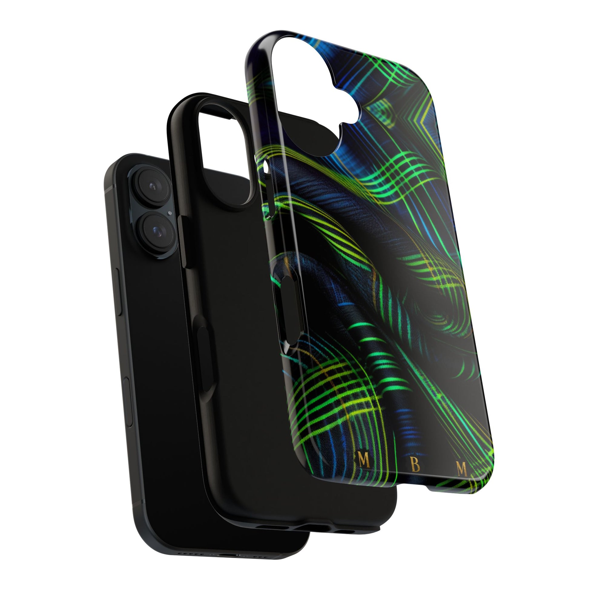 Neon Vine is a stylish blend of sophistication and modern flair. The case features a dark fabric background, adorned with striking neon green lines that add a bold contrast. The graphic has a 3D effect with the folds, creating an intriguing texture that adds depth and dimension. It's not just about looks — this case offers durable protection for your phone while keeping it sleek and fashionable. Perfect for anyone who loves a mix of classic elegance and vibrant, contemporary design.