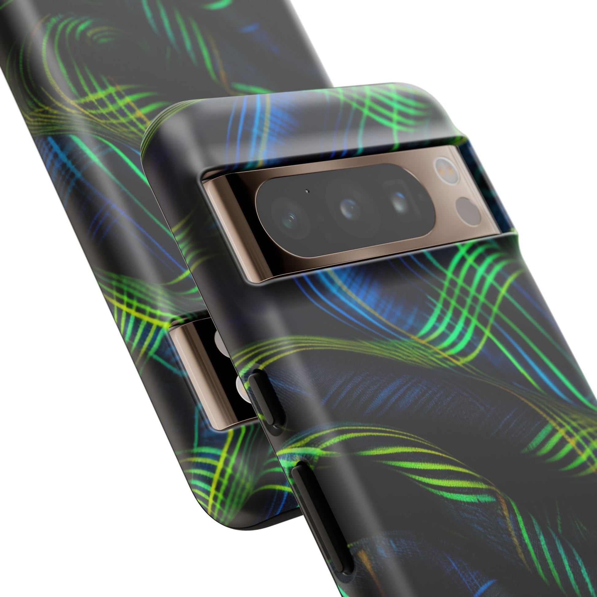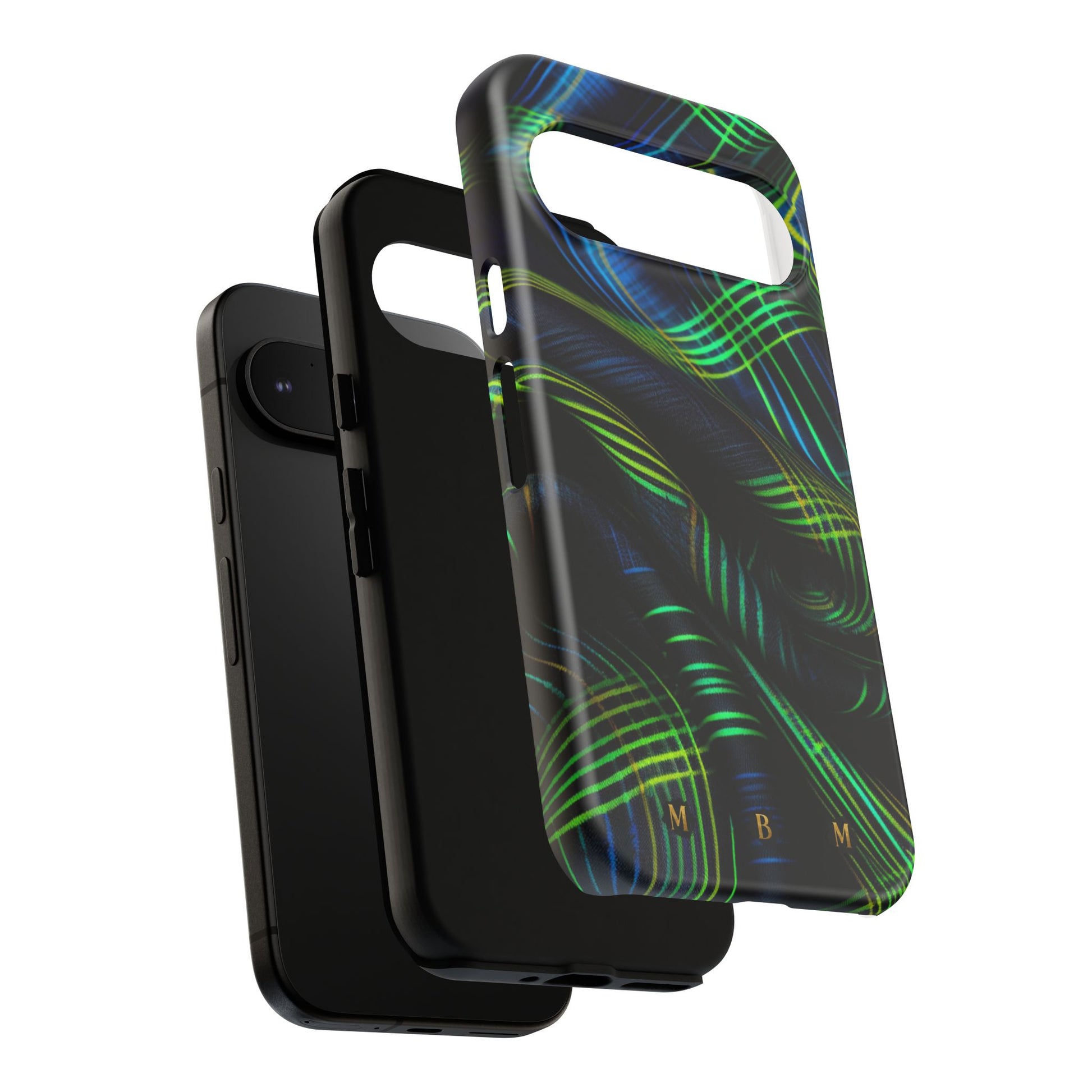 Neon Vine is a stylish blend of sophistication and modern flair. The case features a dark fabric background, adorned with striking neon green lines that add a bold contrast. The graphic has a 3D effect with the folds, creating an intriguing texture that adds depth and dimension. It's not just about looks — this case offers durable protection for your phone while keeping it sleek and fashionable. Perfect for anyone who loves a mix of classic elegance and vibrant, contemporary design.
