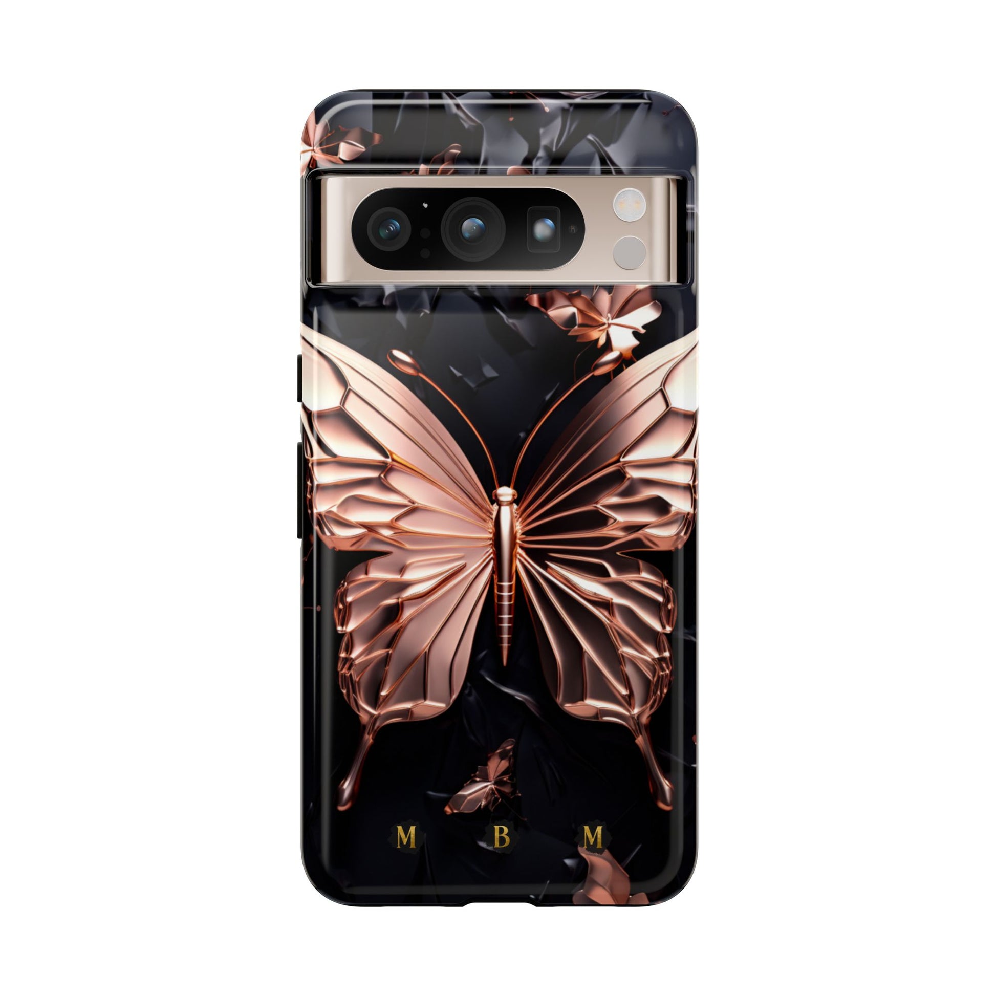 Discover elegance with our exquisite phone case featuring a stunning rose gold butterfly set against a sleek black background. The centerpiece, a beautifully detailed large butterfly, is surrounded by a flurry of smaller rose gold butterflies, creating a captivating and delicate pattern. This design combines sophistication and charm, making your phone not only protected but also a fashion statement. Ideal for those who appreciate intricate beauty and a touch of luxury in their everyday accessories.