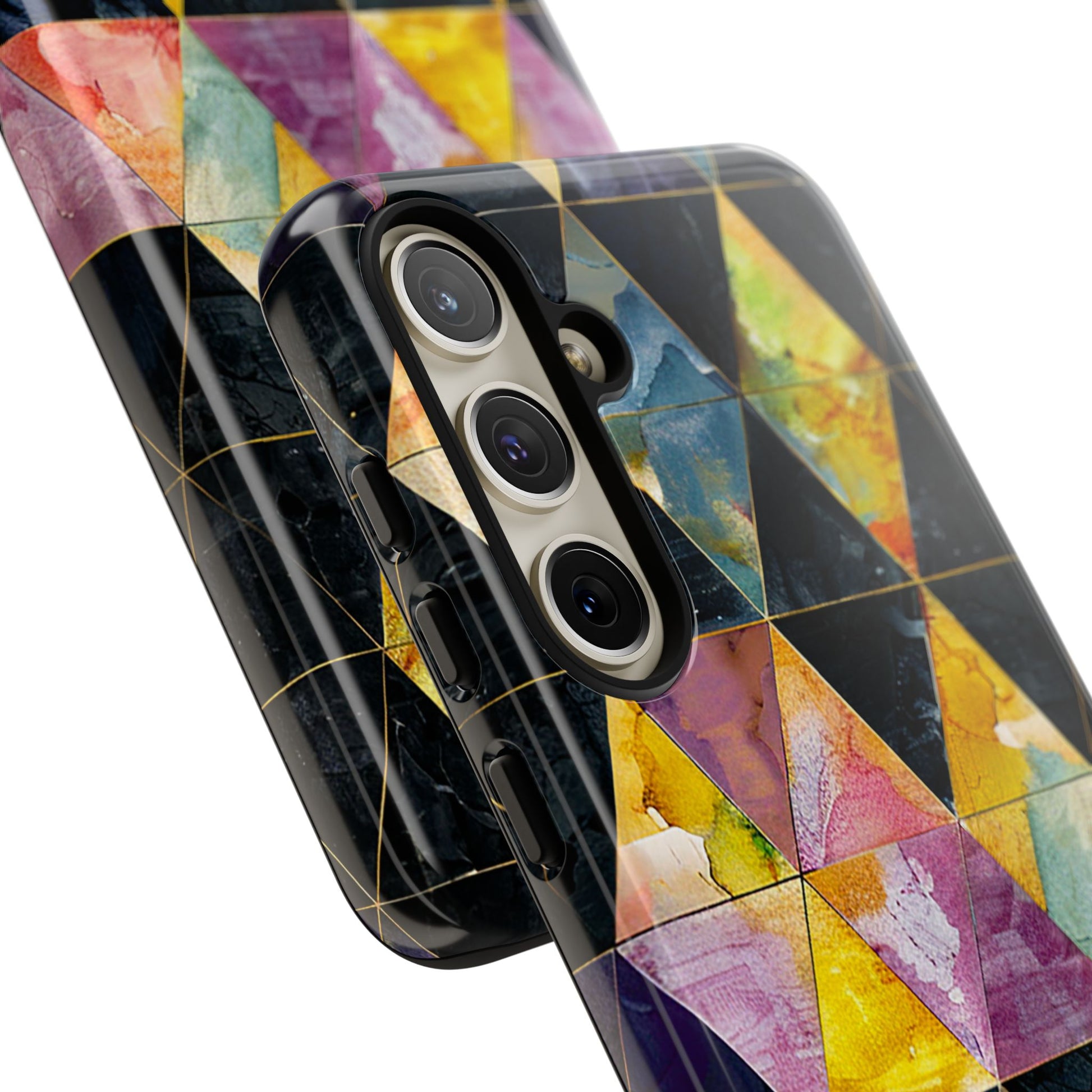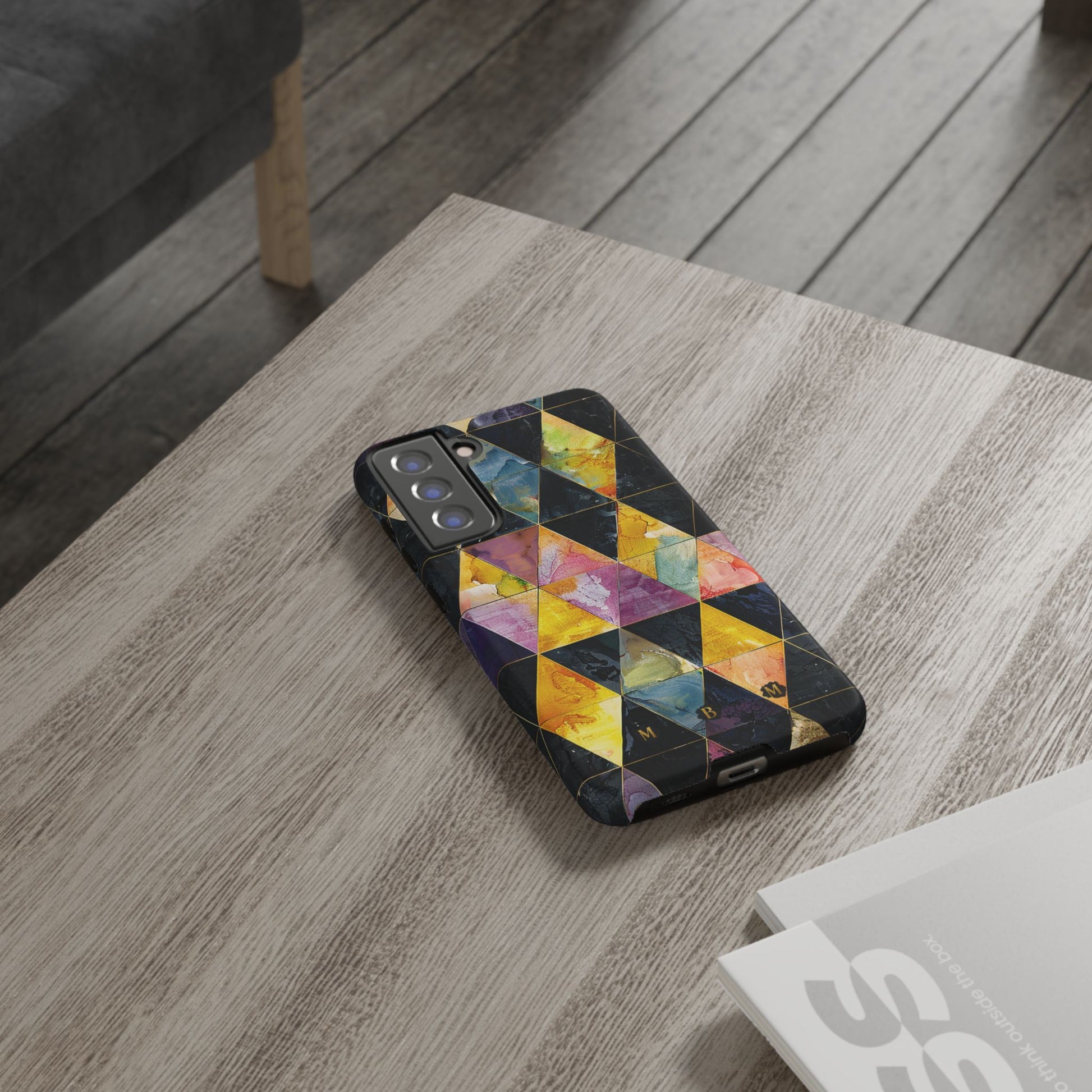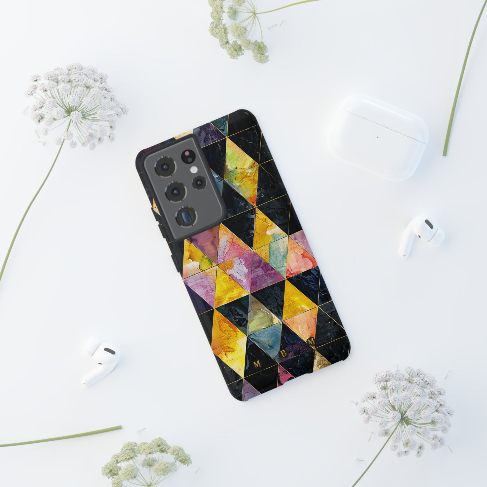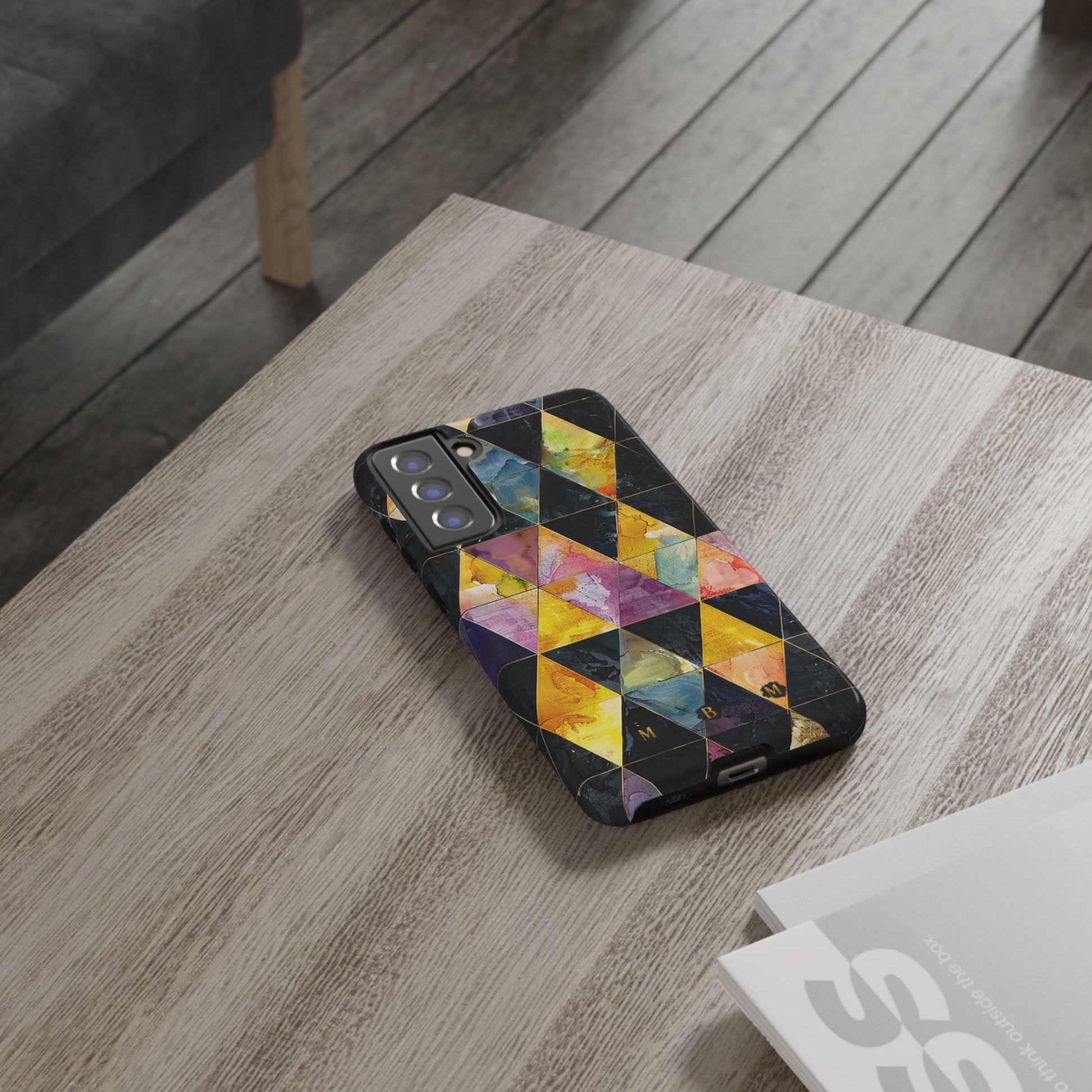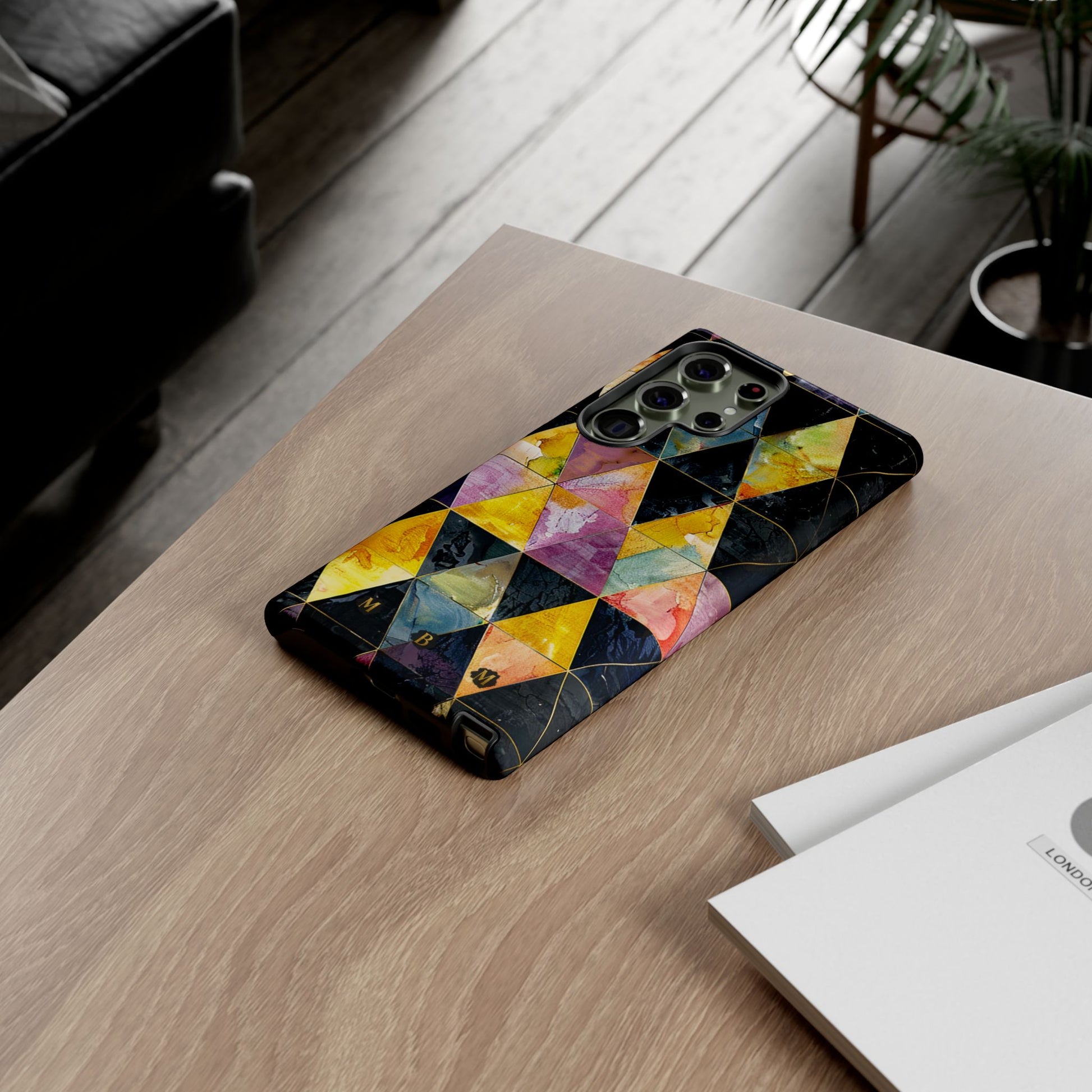 Get ready to dazzle with the Vertex Prism Phone Case! This eye-catching design features a kaleidoscope of vibrant colors splashed across a geometric pattern of triangles. Think of it as a modern art masterpiece for your phone! The mix of purples, yellows, blues, and blacks creates a stunning visual effect that's sure to turn heads. Not only does it look amazing, but it also provides solid protection for your device. Perfect for anyone who loves a pop of color and a touch of sophistication. Make your phone the star of the show with the Vertex Prism Phone Case!