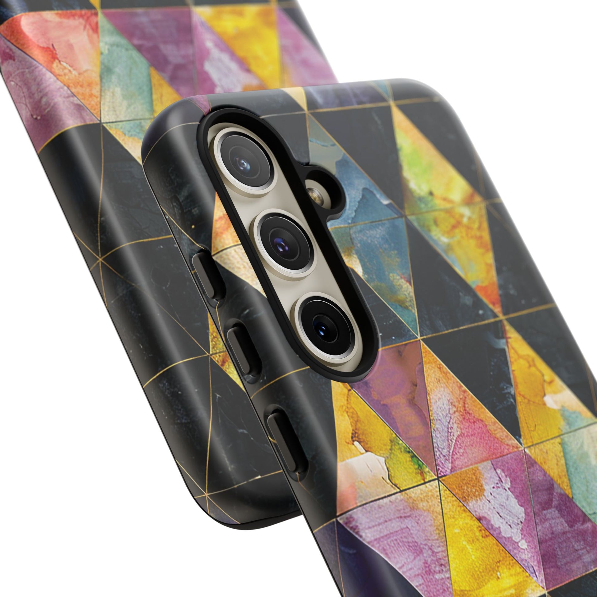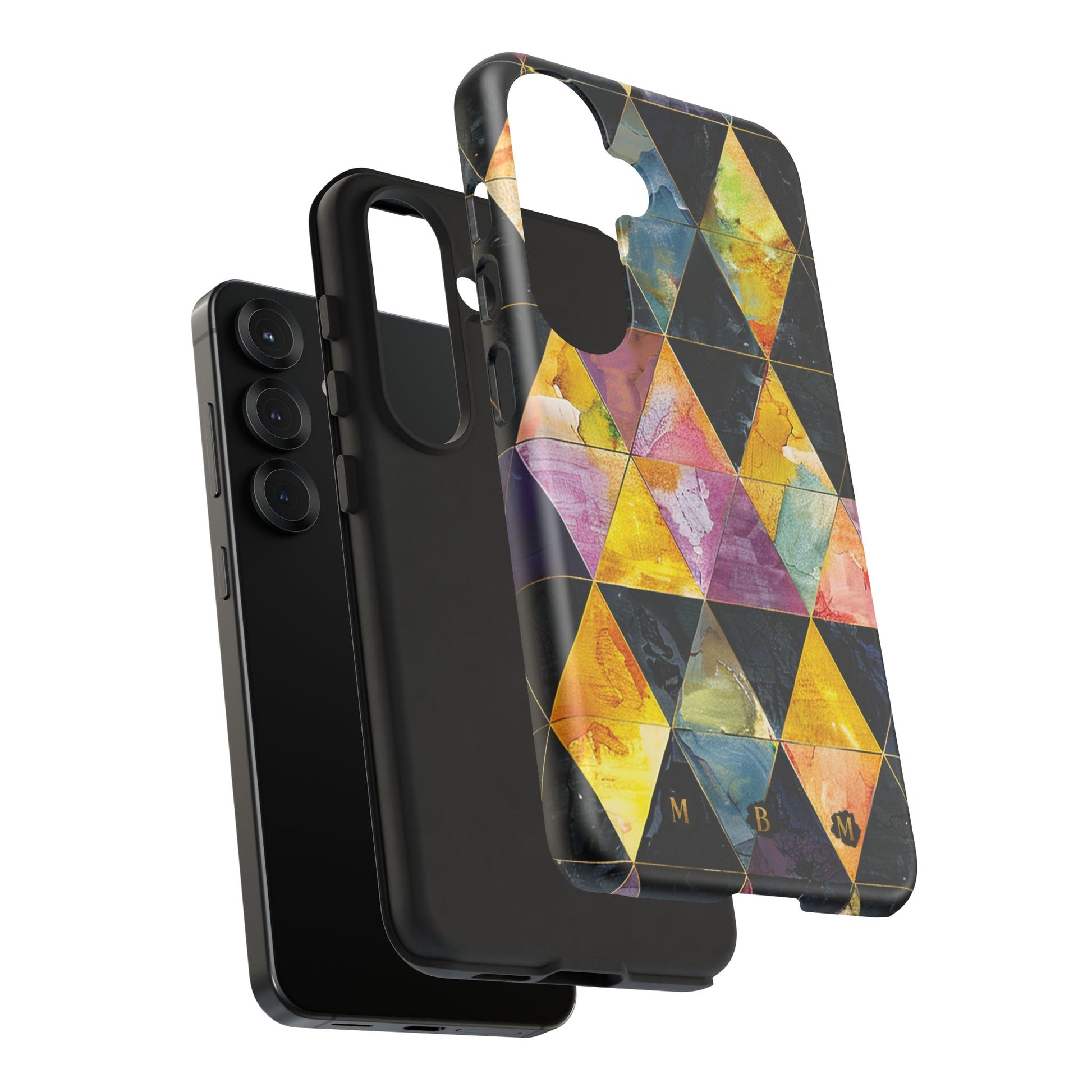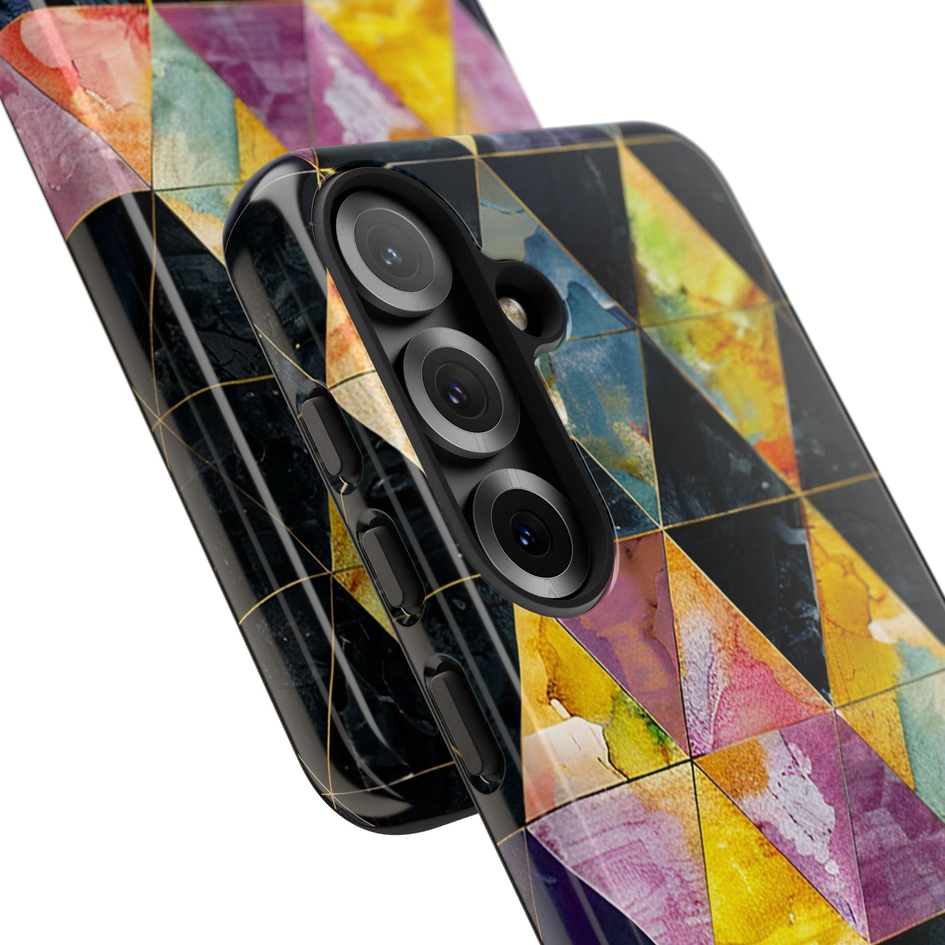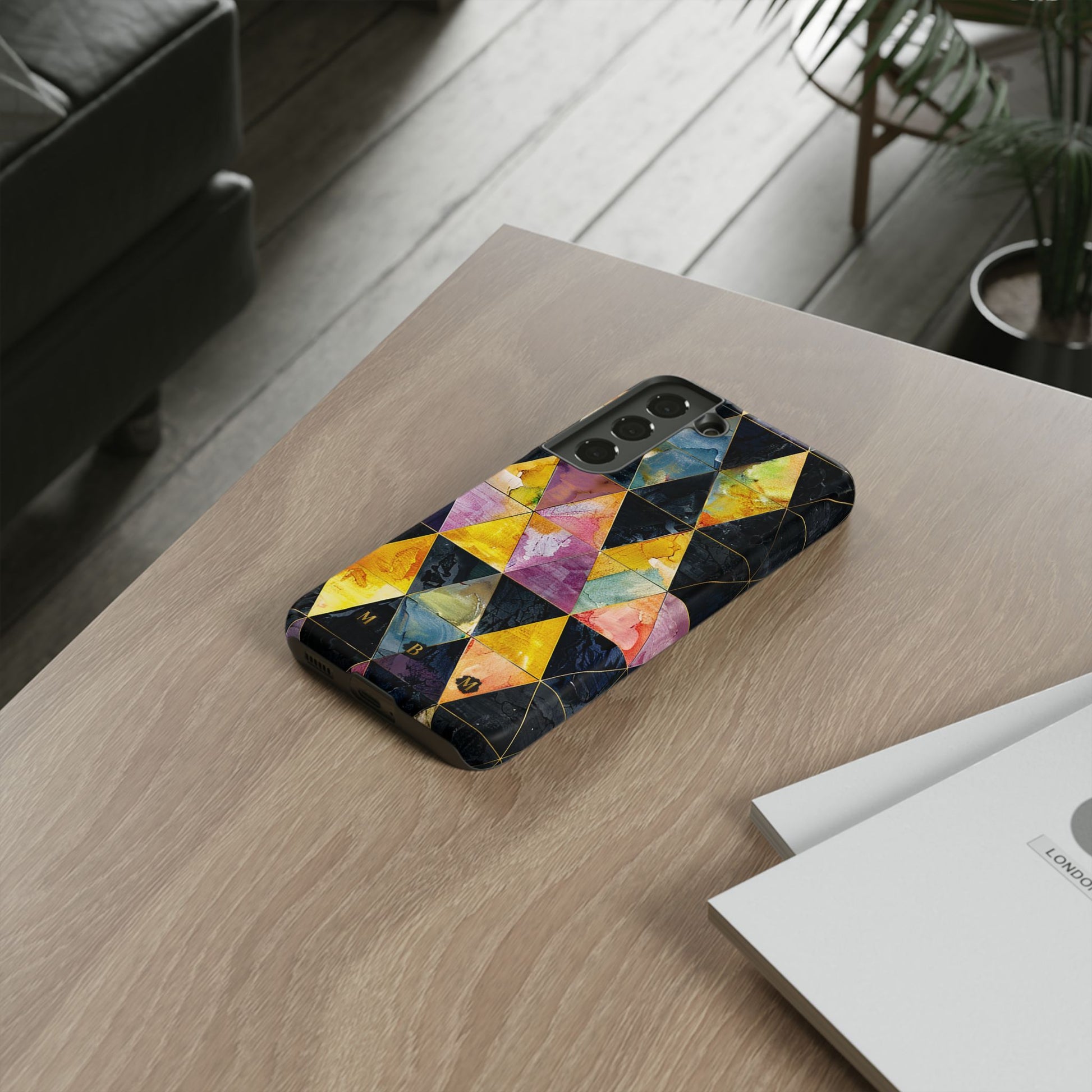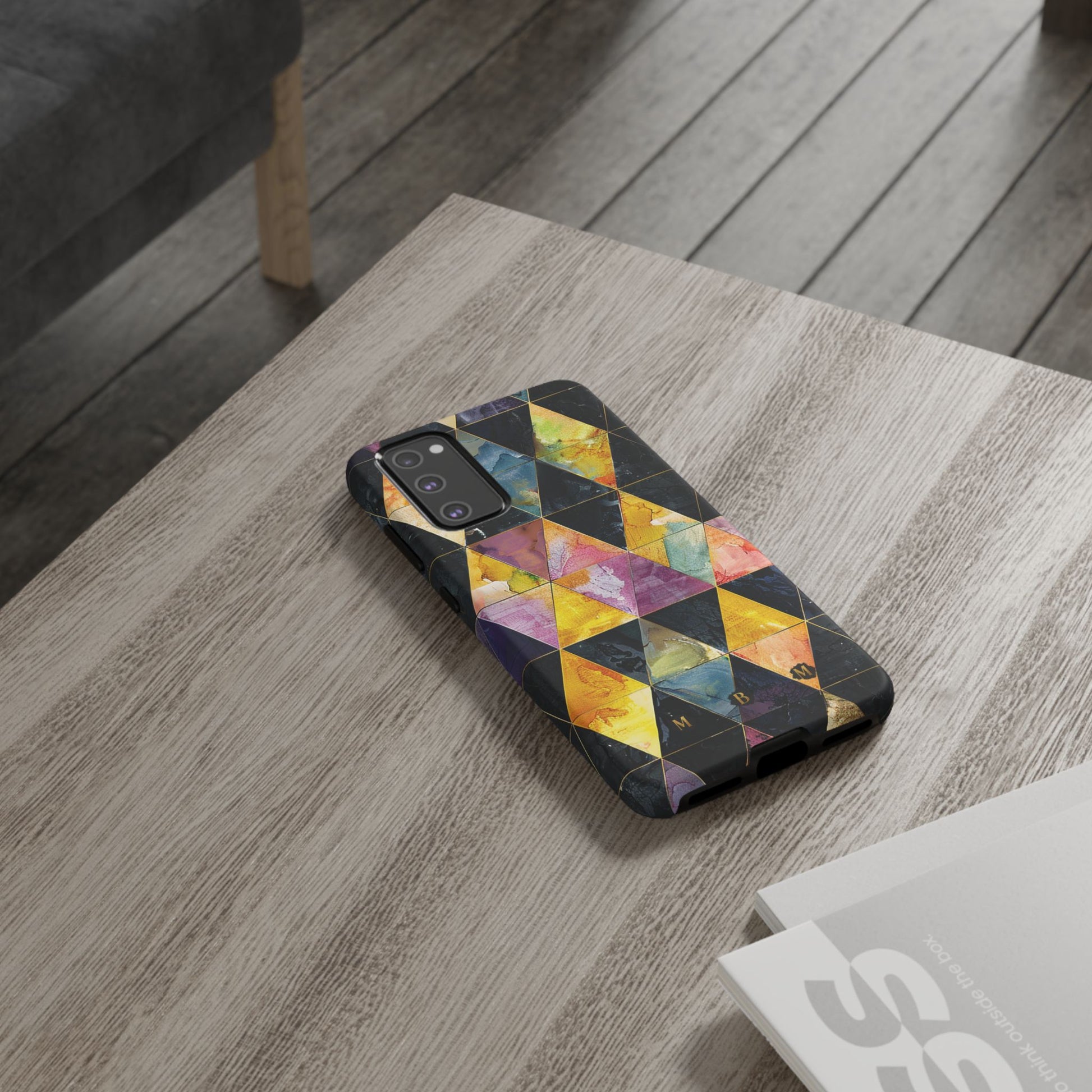Get ready to dazzle with the Vertex Prism Phone Case! This eye-catching design features a kaleidoscope of vibrant colors splashed across a geometric pattern of triangles. Think of it as a modern art masterpiece for your phone! The mix of purples, yellows, blues, and blacks creates a stunning visual effect that's sure to turn heads. Not only does it look amazing, but it also provides solid protection for your device. Perfect for anyone who loves a pop of color and a touch of sophistication. Make your phone the star of the show with the Vertex Prism Phone Case!